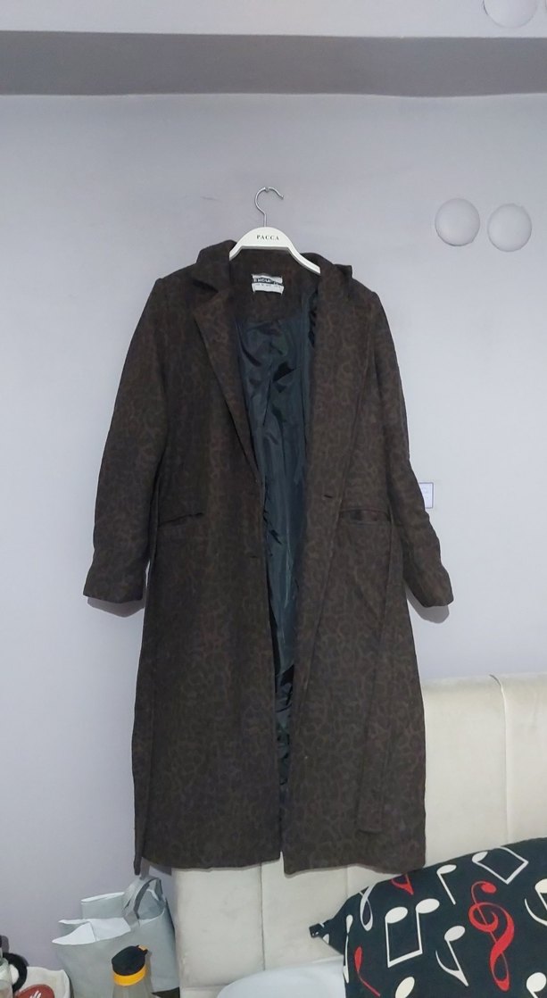 Kahverengi, uzun ve leopar desenli kadın kabanı. Klasik yaka ve ön cepler içerir, iç kısmı düzgün astarlıdır.