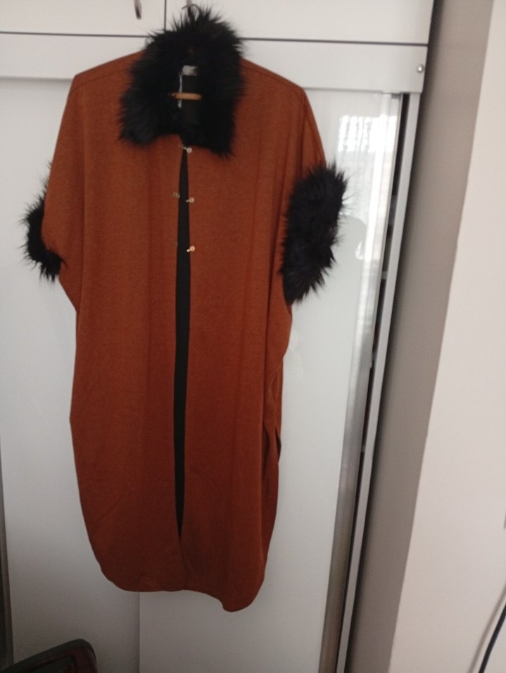 Kahverengi uzun kadın kaban, bol kesim, yakada ve kollarda kürk detaylıdır. Uzun kollu ve yumuşak dokuludur, bohem tarzı için uygundur.