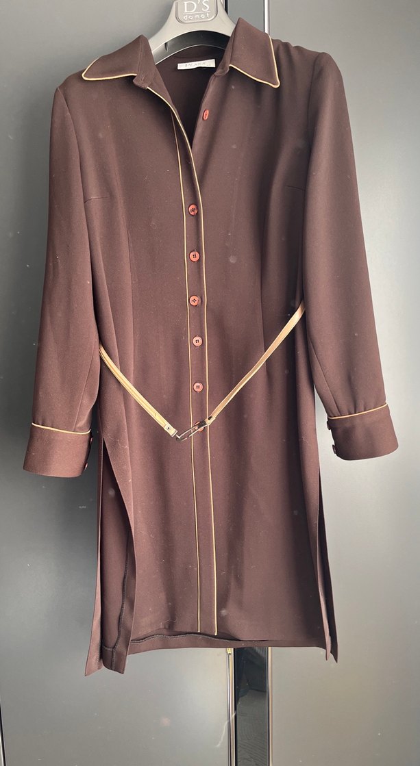 Kahverengi uzun kadın tunik -elbise kemerli ve kesimli yakalıdır. İpeksi kumaştan, uzun kollu ve parlak dokusuyla iş ortamı için uygundur.