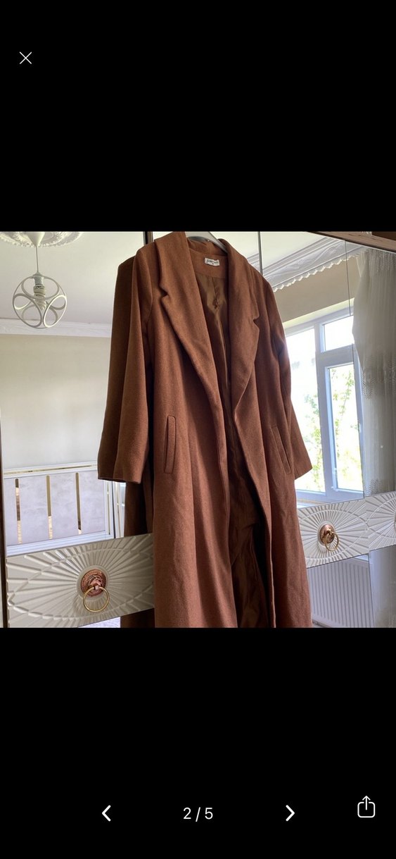 Kahverengi uzun keten kaban, kesik yaka ve drapeli tasarıma sahiptir. Ofis kullanımı için uygun, uzun kollu ve düz desensizdir.
