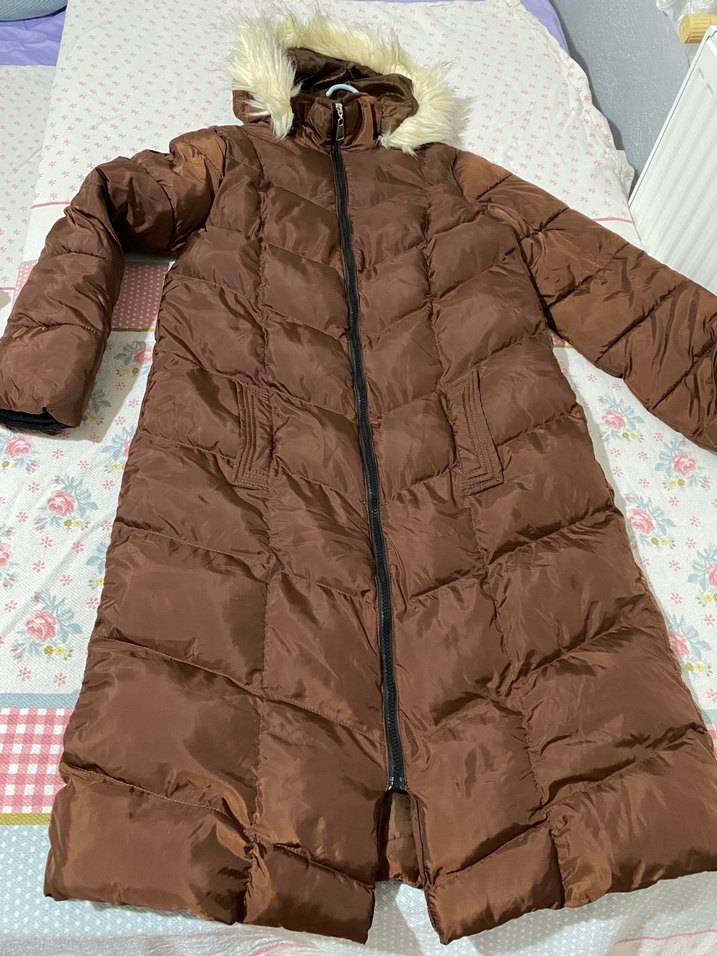 Kahverengi, uzun ve fermuarlı bu kadın kışlık mont, suni kürklü kapüşonuyla rahat ve şık bir sokak giyim tarzı sunar. Günlük kullanım için uygundur. ❄️sadece cebinin ic kismi sokuldu gorunmuyor ama ic kisimda oldugu icin bir cebinde mevcut diger cebi kullaniliyor