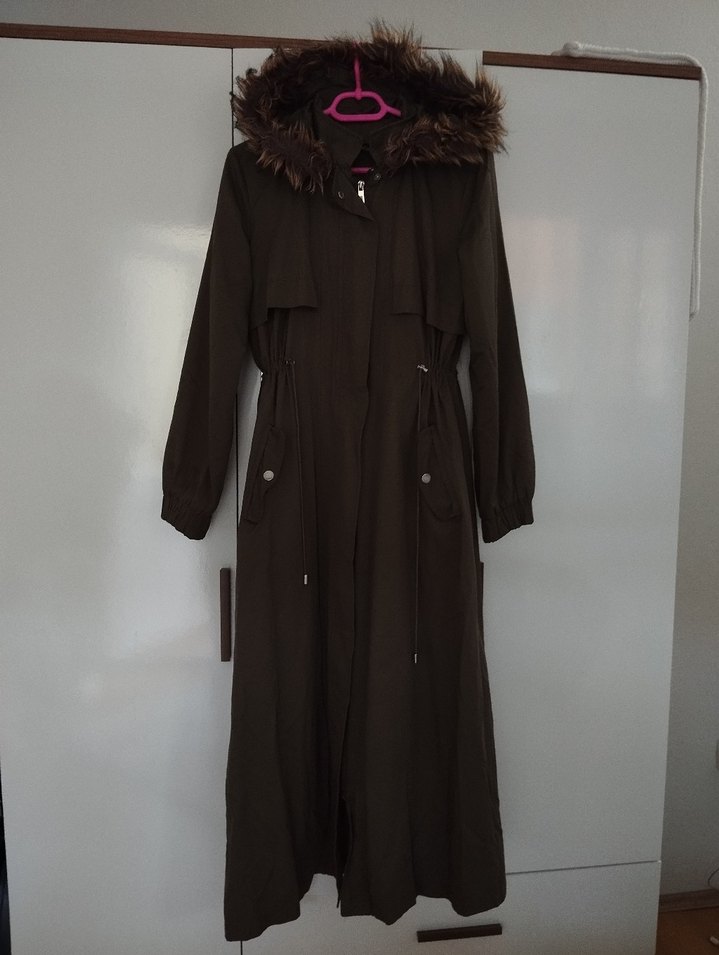 Kahverengi uzun kadın ceketi, bol kesim ve kürk detaylı kapüşon içerir. Notlu yaka ve uzun kolludur, rahat ve şık bir görünüm sunar. Yumuşak ve sıcak kumaştan yapılmıştır. çok az kullanıldı yeni gibidir 120 cm boy uzunluğu