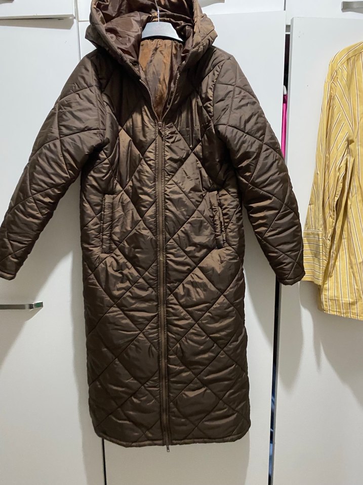 Kahverengi uzun mont, kapitone desenli, yaka kısmı kesimli ve fermuarlı. Bol kesim ve uzun kollu, sentetik kumaştan, rahat sokak stili için uygun.
