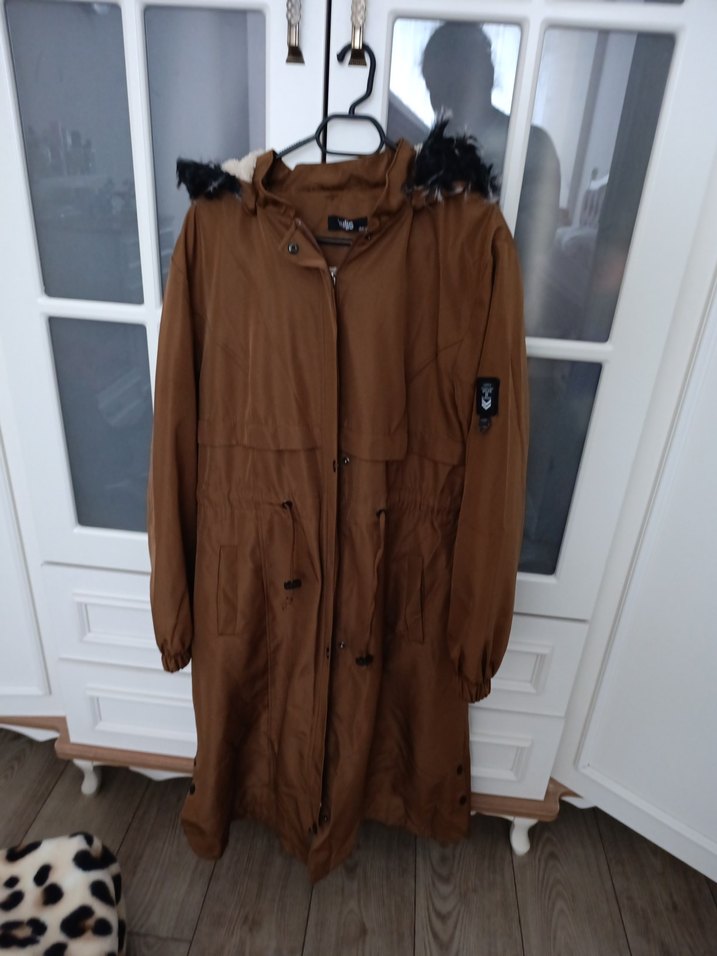 Kahverengi, uzun boy kadın mont, bol kesim, kürklü kapüşon ve uzun kolludur. Yumuşak ve sıcak kumaştan, gündelik sokak stili için uygundur.