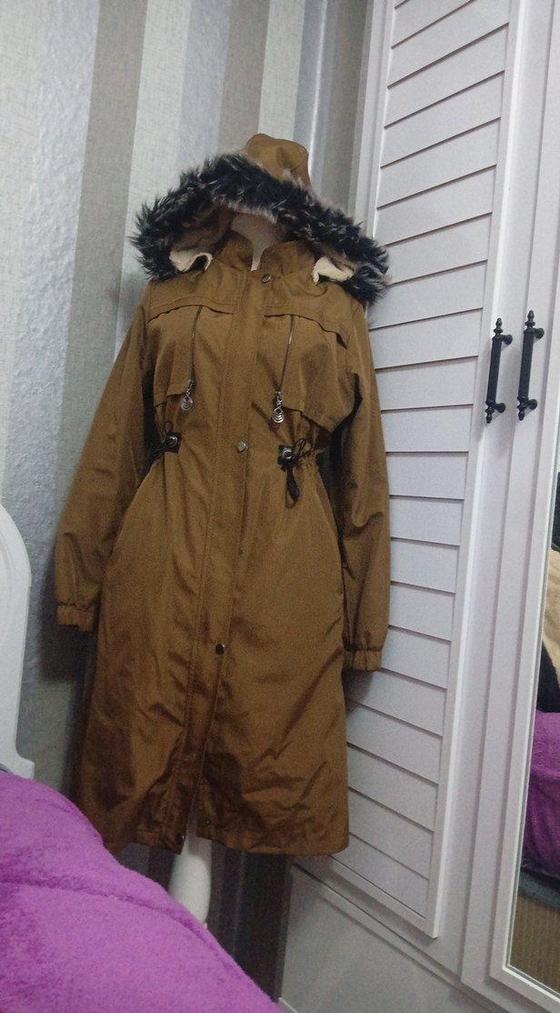 Kahverengi uzun kadın parka, bol kesim ve kesik yaka detayıyla dikkat çeker. Uzun kollu ve kürklü kapüşonlu, sentetik kumaştan üretilmiştir. Günlük kullanıma uygundur. 38 neden ancak 40a da rahat olur 2defa kullanıldı