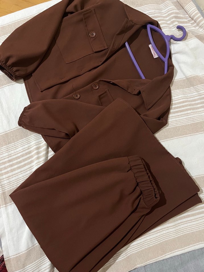 Koyu kahverengi, uzun kesim ve regular fit kadın takımı. Düğmeli önü, kesik yaka ve uzun kollu, düz desenli, sentetik kumaştan üretilmiştir. Günlük ve sokak tarzı için uygundur. ( 1 kez giydim sadece )