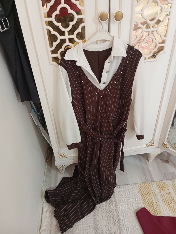 Kahverengi uzun tulum, kolsuz ve yakası kesik detaylıdır. Dökümlü ve regular fit olup, sentetik kumaştan üretilmiştir. Günlük kullanıma uygundur. 40 44 kadar olur