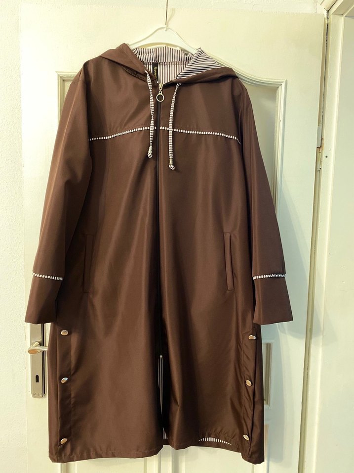 Kahverengi uzun kadın yağmurluk, bol kesim ve fermuarlı ön kapamalıdır. Uzun kollu, çıtçıt detaylı, parlak sentetik kumaştan yapılmıştır. Paris tarzı normcore stilinde, günlük kullanıma uygundur. ☔