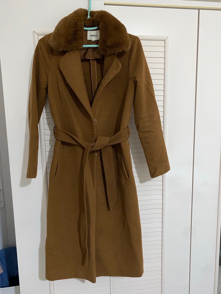 Kahverengi uzun kaşe kaban, kürklü kesik yakalı ve uzun kollu. Rahat kesim ve kemer detaylı, ofis için uygun rahat sokak stili.