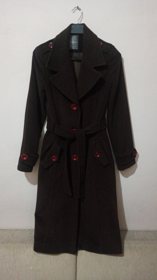 Kahverengi uzun kaban, kemer ve büyük kahverengiı düğmelerle. Yaka ve düğmeli manşetlere sahip, ceplidir. ürün kalın sıcacık kumaslidir koltuk altlarında dikilebilir yırtıkları mevcuttur