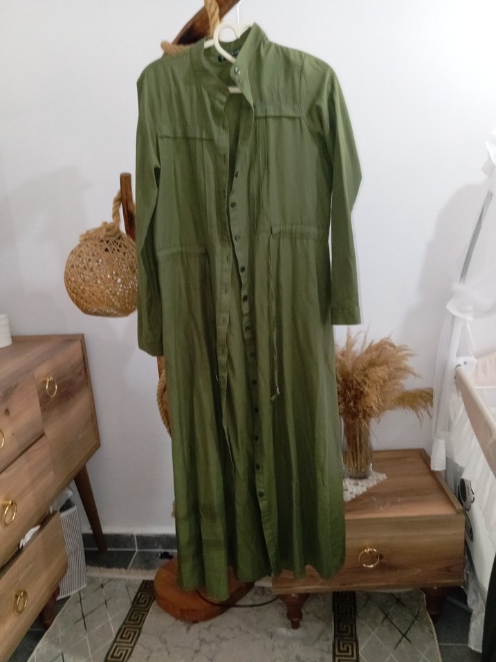 Kahverengi uzun keten elbise, bol kesim, uzun kollu ve yakalıdır. Bel kemeri ile bohem tarzı günlük kullanım için uygundur.