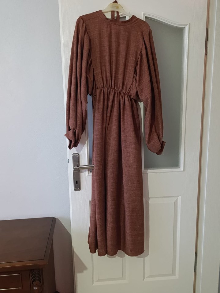 Kahverengi uzun keten elbise, drapeli ve bol kesimlidir. Uzun kollu, yüksek yakalı ve vintage bohem tarzındadır. Günlük kullanıma uygundur.