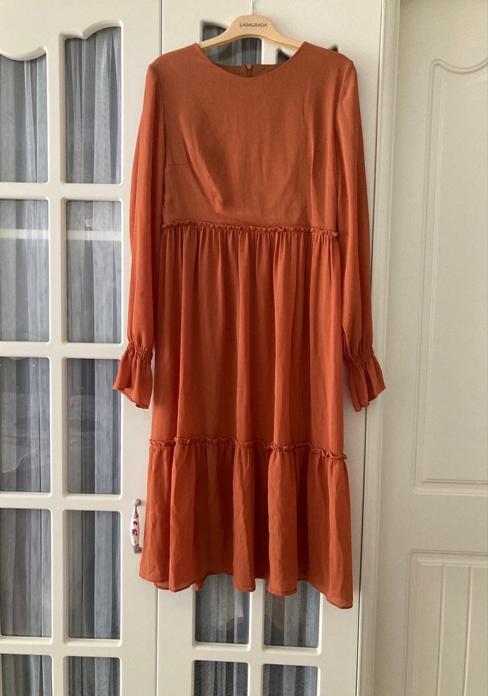 Kahverengi uzun keten elbise, uzun kollu ve bol kesimdir. Fırfır detayları ve yuvarlak yakasıyla bohem tarzını yansıtır.