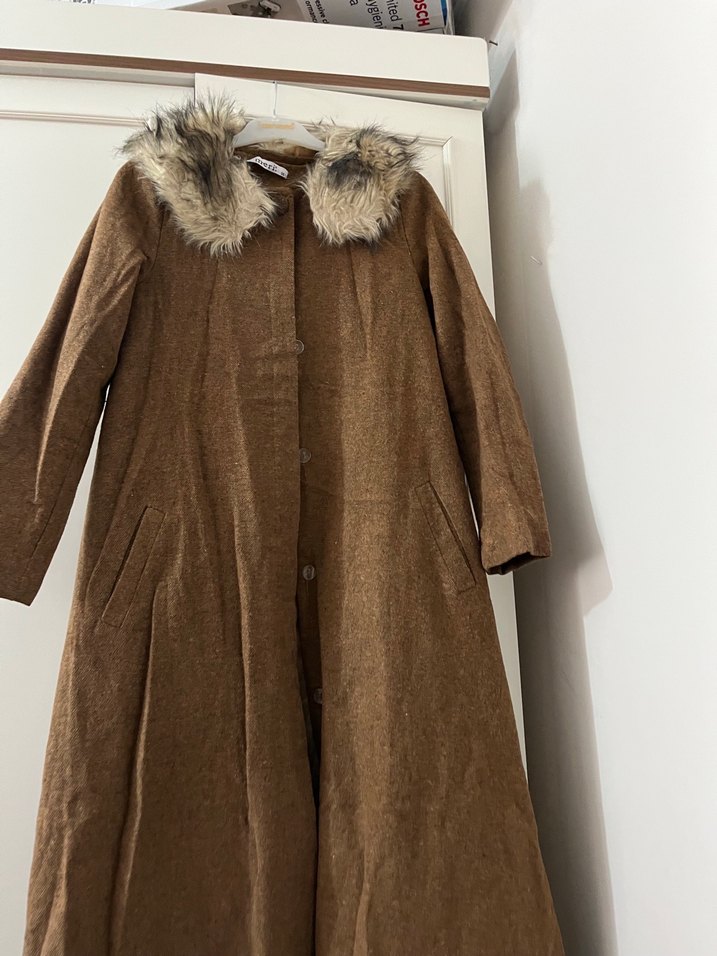 Kahverengi uzun keten kadın kaban, bol kesim ve kürklü yakaya sahip. Uzun kollu, desensiz ve rahat bir dokusu var. Günlük kullanıma uygun.