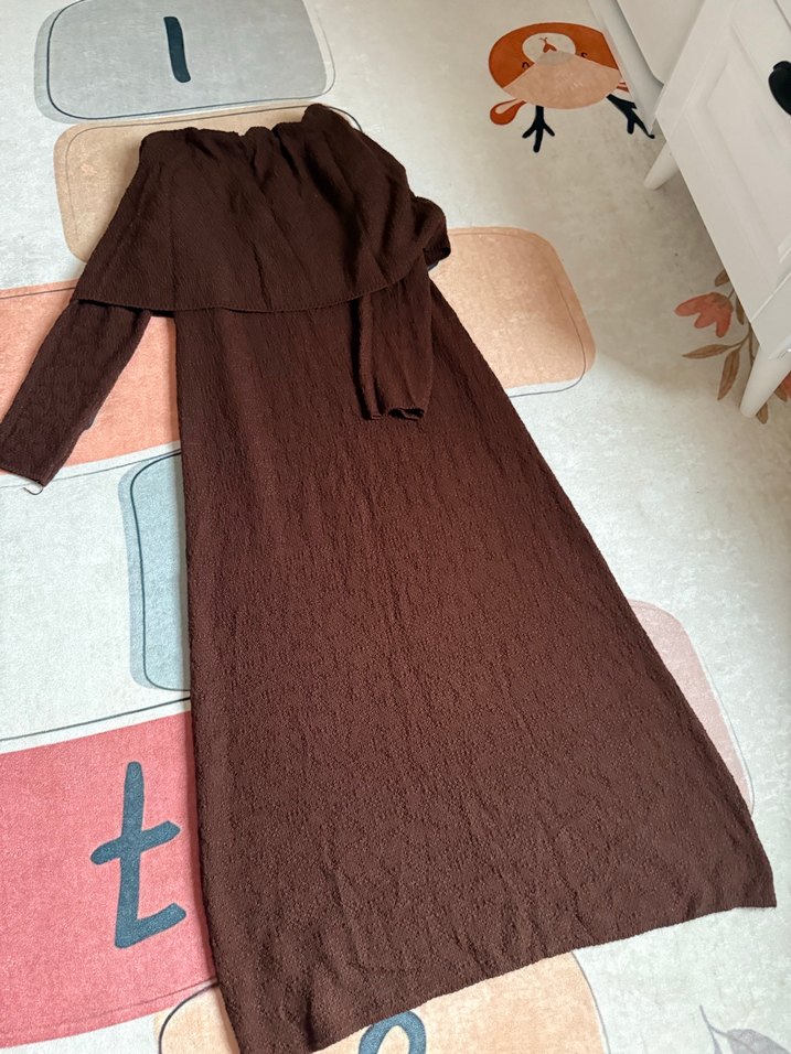 Kahverengi, uzun kesim keten , bol kesim ve drapeli omzu açık tasarıma sahip elbise. Uzun kollu ve straplez yakalı, mütevazı bohem tarzında. Günlük kullanım için uygun. S m bedene uygundur