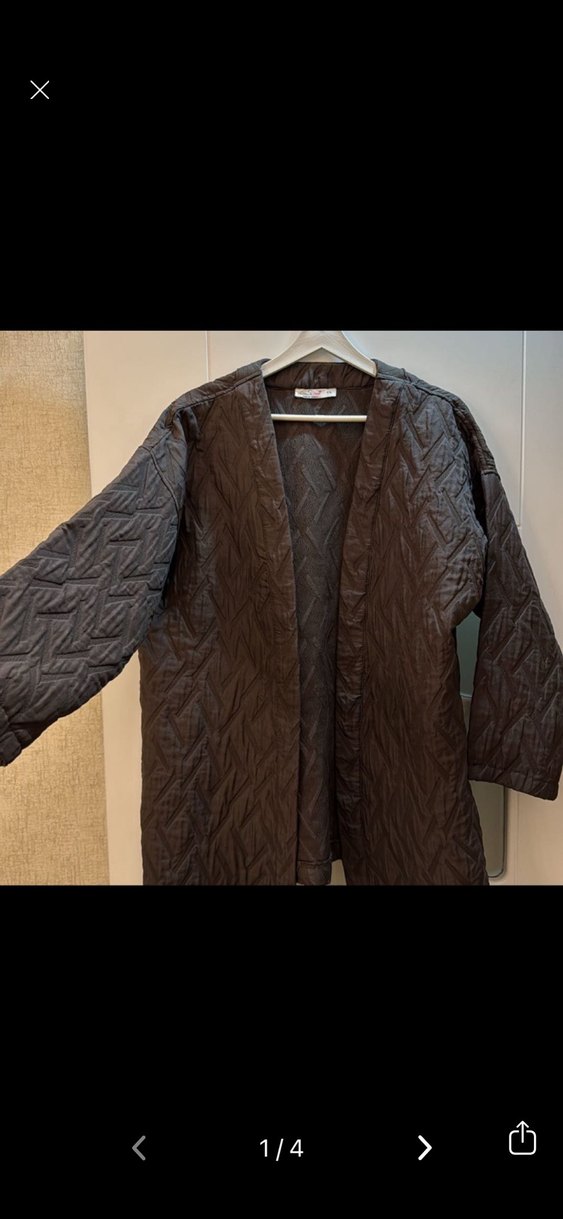 Koyu kahverengi uzun keten ceket, bol kesim, pilili detaylar ve kesik yaka ile. Desensiz, kapitone dokusu rahat ve bohem tarzına uygun.