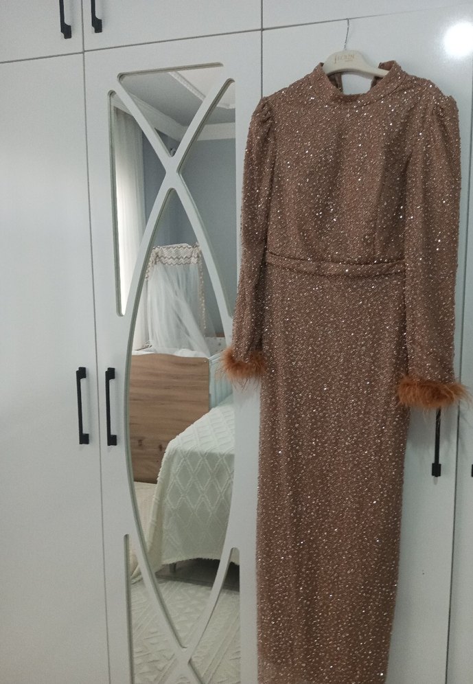 Kahverengi, uzun kol ve kürk detaylı manşetlere sahip, yüksek yakalı, modern klasik tarza uygun, vücuda oturan uzun abiye elbisedir. ✨