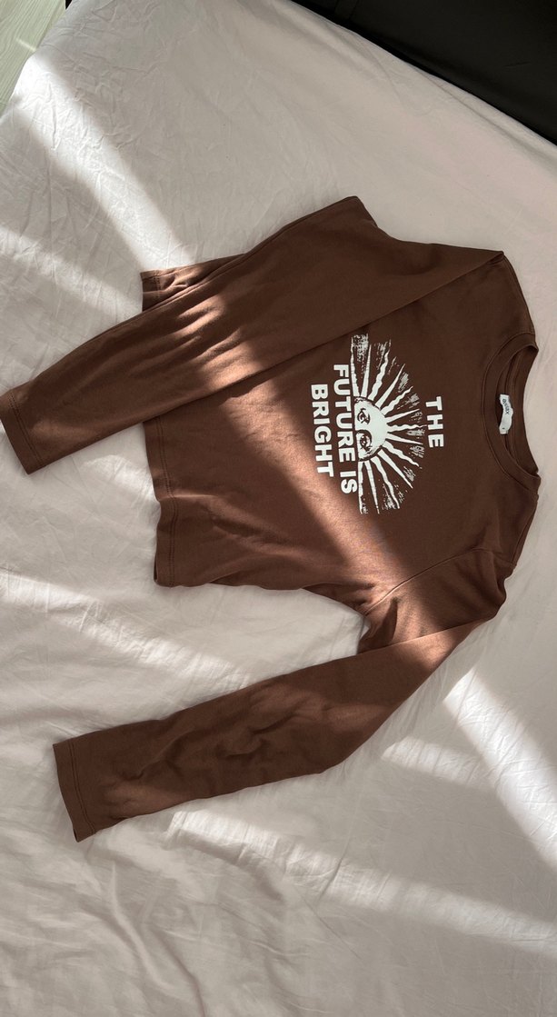 Koyu kahverengi, deri görünümlü kumaştan yapılmış, uzun kollu ve bisiklet yakalı, baskılı ve fitted hamile tişörtü. Günlük şıklık için uygun. ✨ 2 kere falan giydim