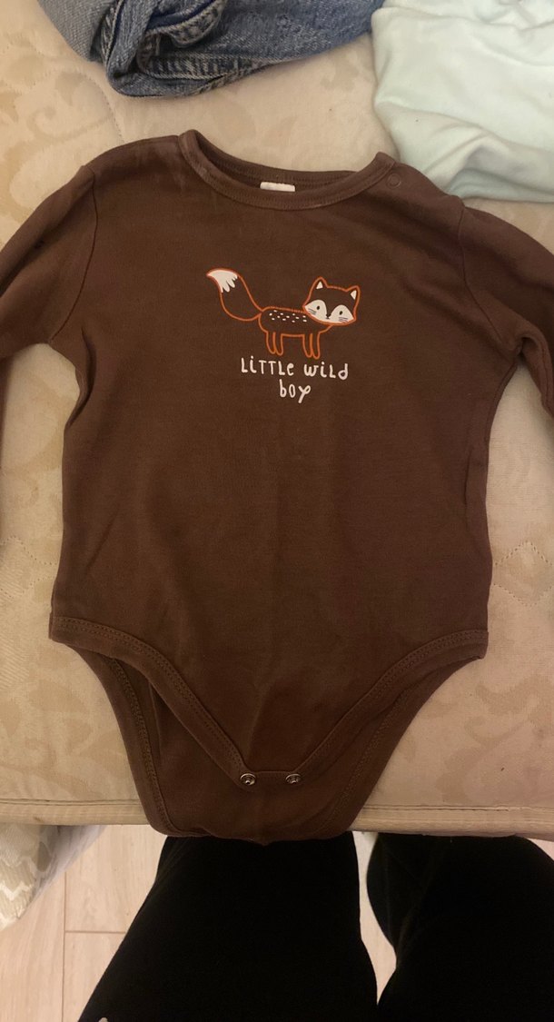 Kahverengi uzun kollu, yuvarlak yakalı bebek body. Üzerinde tilki ve "Little wild boy" yazısı baskılı. Yumuşak ve sıcak kumaştan, çıtçıtlı kolay giyimli.