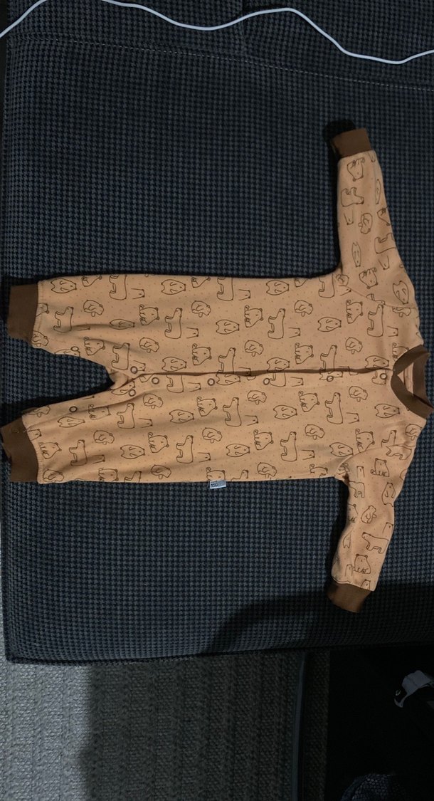 Koyu kahverengi, uzun kollu, düğmeli ve yuvarlak yakalı bebek tulumu. Yumuşak ve sıcak kumaştan, sevimli hayvan desenli.