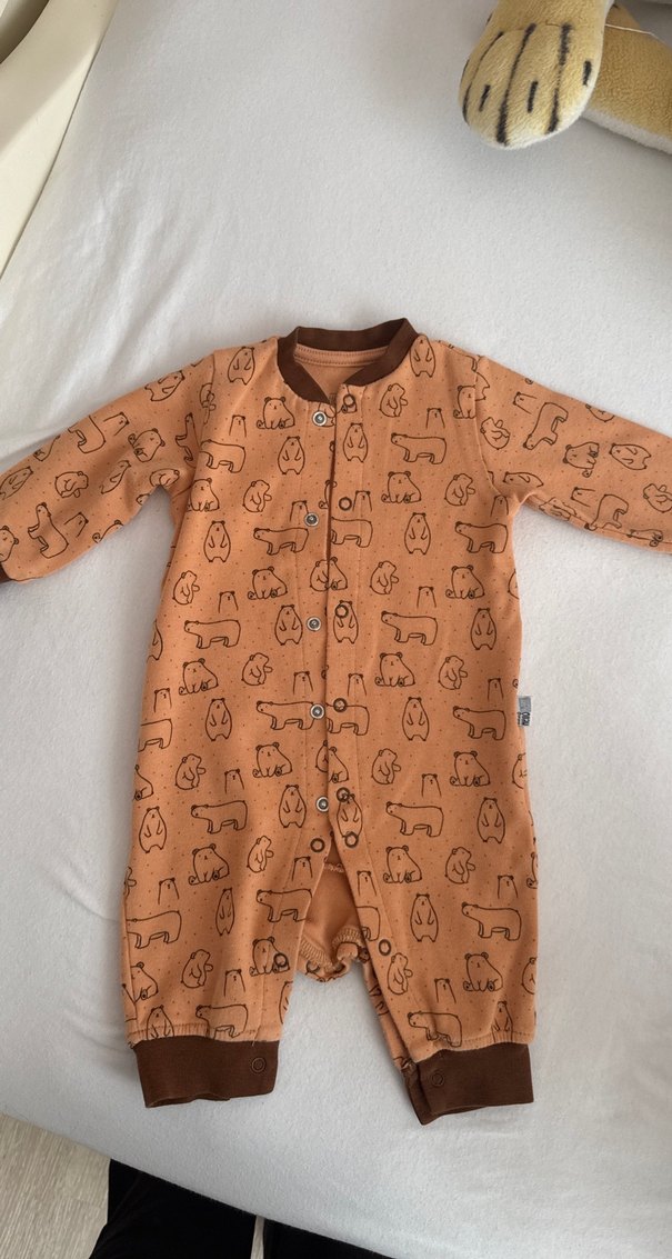 Yumuşak ve sıcak kahverengi bebek tulumu, uzun kollu ve yuvarlak yakalıdır. Düğmeli ve sade hayvan desenlidir. Kullanılmadı. yılandı , ütülendi.