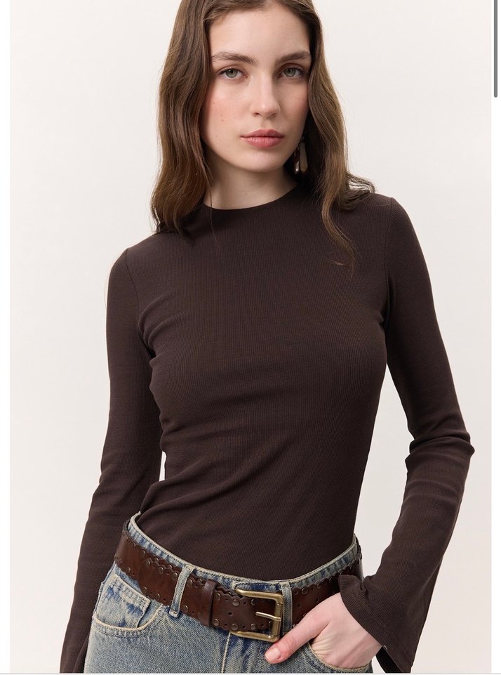 Koyu kahverengi deri görünümlü, uzun kollu ve bisiklet yaka, normal boyda dar kesim bluz. Günlük kullanıma uygun rahat ve şık bir parça temiz kusursuz 1 kez kullanıldı