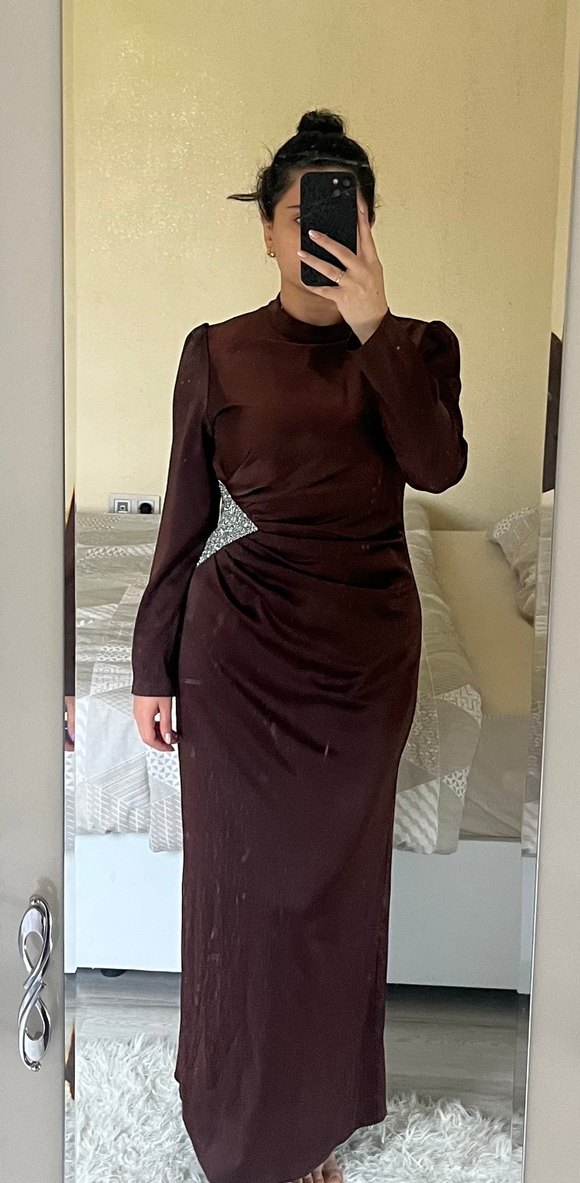 Kahverengi, uzun kollu, yüksek yakalı, vücuda oturan bu abiye elbise belinde drapeli detayla şık ve zarif bir görünüm sunar. Ürün çok az kullanıldı ve olduğunuzdan daha zayıf ve şık gösteren bir model .