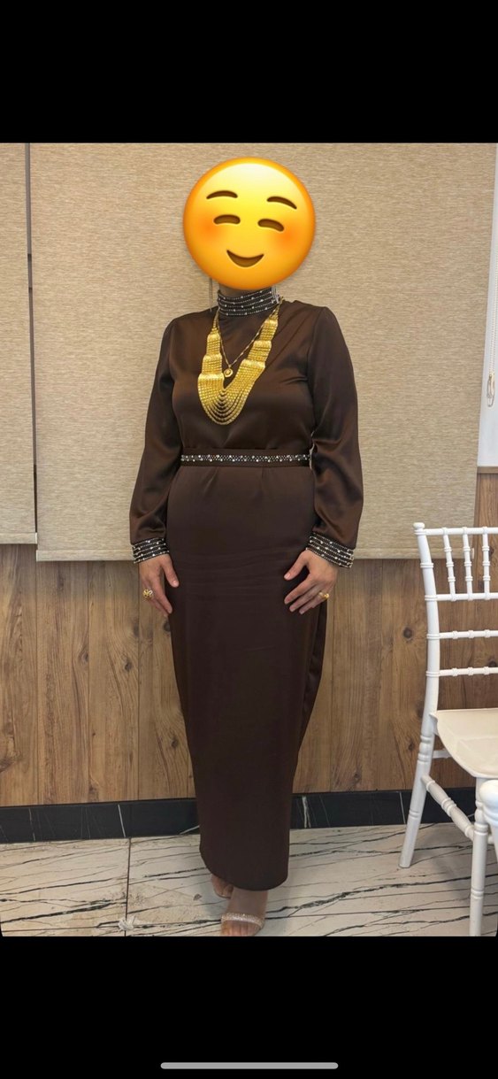 Uzun kollu, yüksek yakalı ve drapeli tasarıma sahip kahverengi abiye elbise, etnik desenlerle süslenmiştir. Düğün için uygun, sade ve klasik bir modeldir.