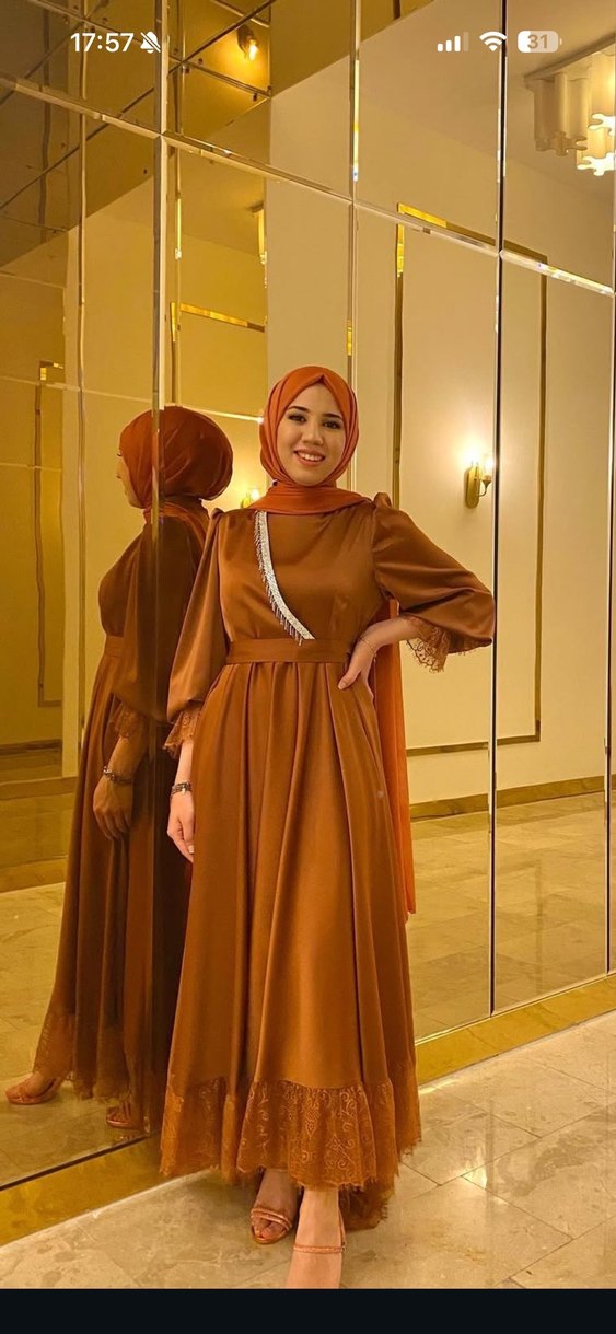 Kahverengi Uzun Kollu Drapeli Kadın Elbise