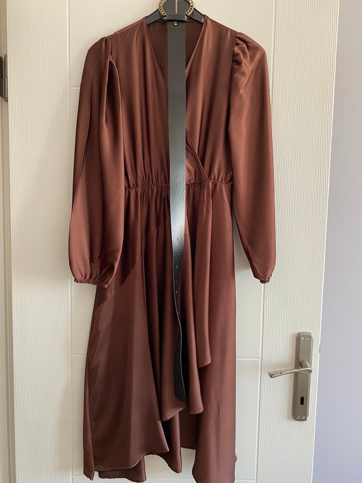 Kahverengi, ipeksi kumaşlı uzun kollu ve drapeli kadın elbisesi. V yaka ve regular fit ile günlük kullanıma uygundur.