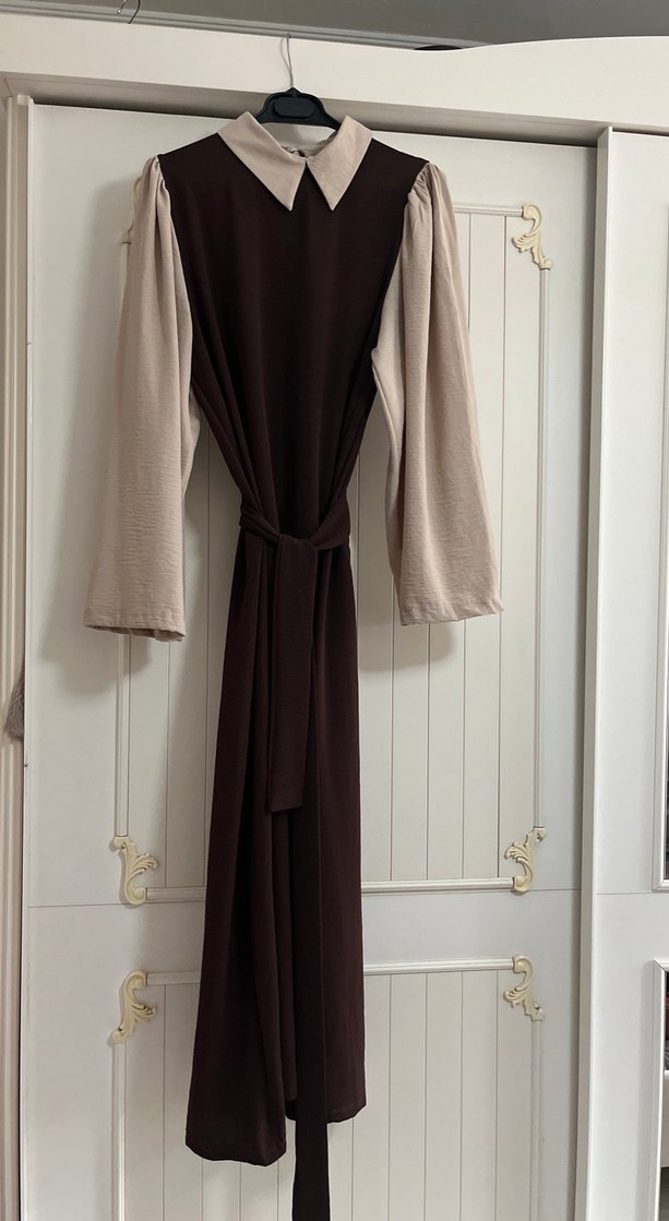 Kahverengi, uzun kollu ve yüksek yakalı uzun elbise, drapeli tasarım ve regular kesime sahip. Pürüzsüz sentetik kumaştan, çağdaş Paris tarzında ve ofis kullanımı için uygun.İnce yapıdadır.Kol lastiklerini ben çıkardım mevcut değil bol ve güzel dökümlü duruyor. Boy:138cm İki kol arası:55cm