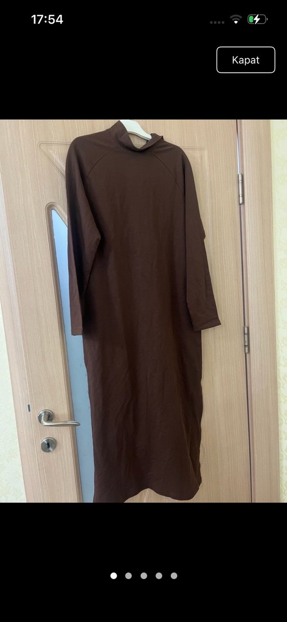 Yüksek yakalı, uzun kollu, kahverengi uzun elbise, dökümlü tasarıma sahip, yumuşak sentetik kumaştan üretilmiştir.