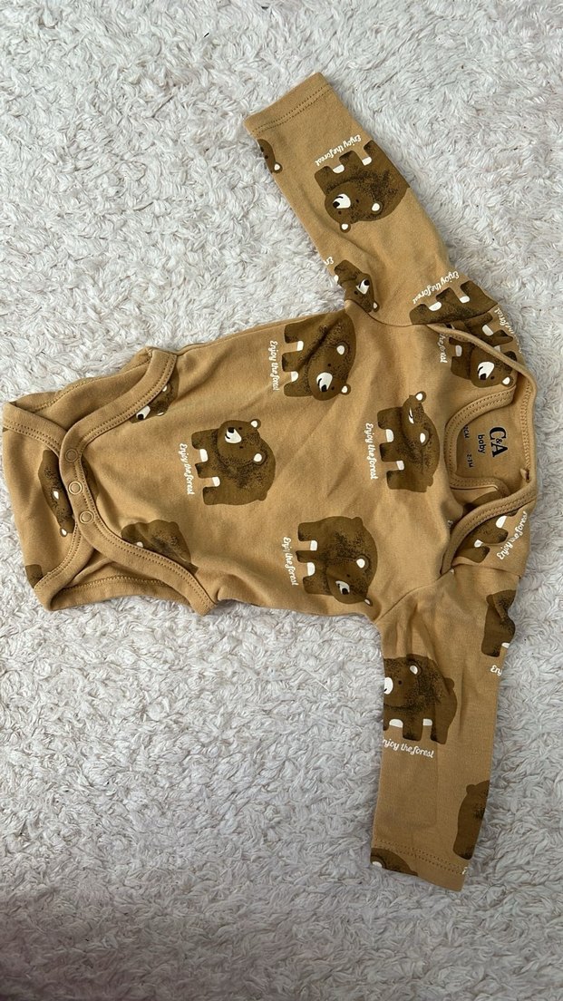 Kahverengi, uzun kollu, yuvarlak yakalı bebek body. Yumuşak kumaş ve kürk detaylı sevimli ayı desenleri içerir. Rahat ve sıcak tutar.