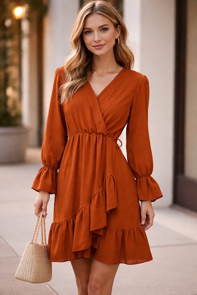 Kahverengi Uzun Kollu Fırfırlı Kadın Elbise