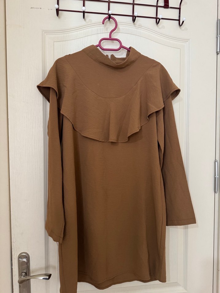 Kahverengi renkli, keten kumaşlı, yüksek yakalı ve fırfırlı detaylı, uzun kollu, midi boy rahat kesim tunik. Günlük kullanıma uygundur.