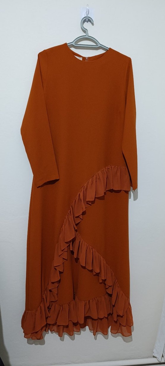 Kahverengi uzun kol, yüksek yakalı, bol kesim elbise. Fırfır detayıyla çağdaş bir görünüm sunar. Yumuşak sentetik kumaştan üretilmiştir.