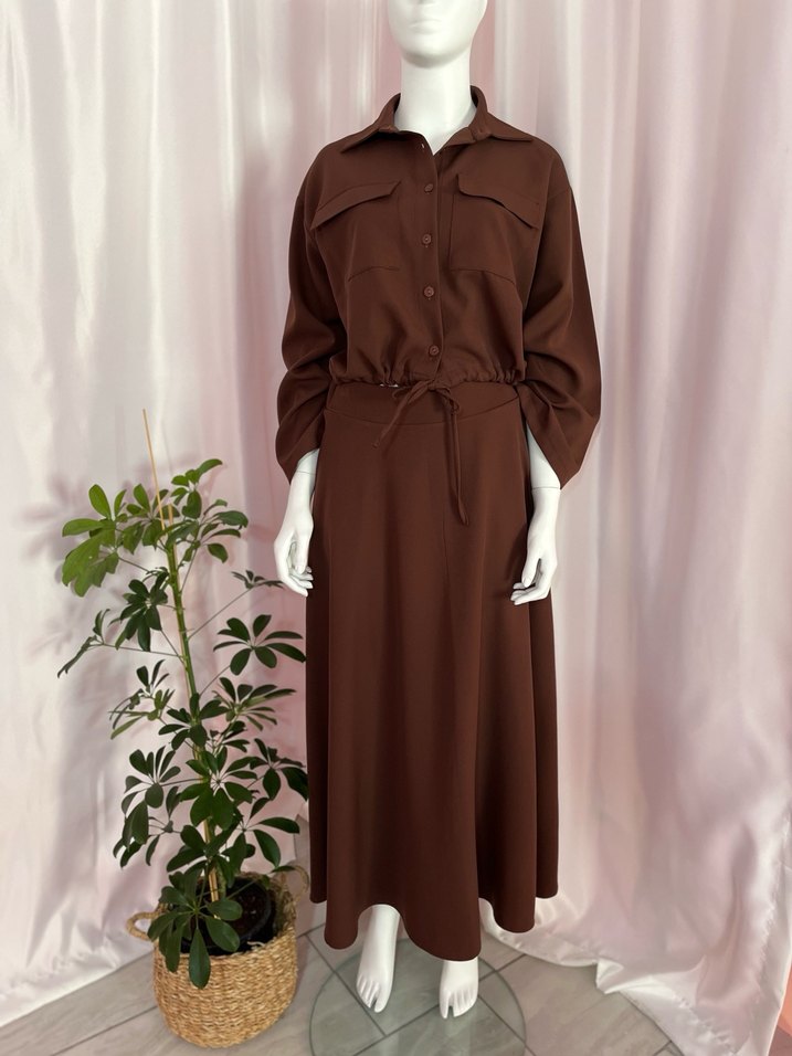 Kahverengi uzun kollu, yakalı ve kemerli bu ikili takım bol kesimiyle rahat bir görünüm sunar. 38- 40-42- 44 bedenleri mevcuttur