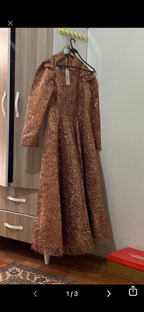 Kahverengi uzun kollu, işlemeli ve parlak detaylara sahip abiye elbise. Kayık yaka ve drapeli tasarımıyla modern klasik şıklık sunar.
