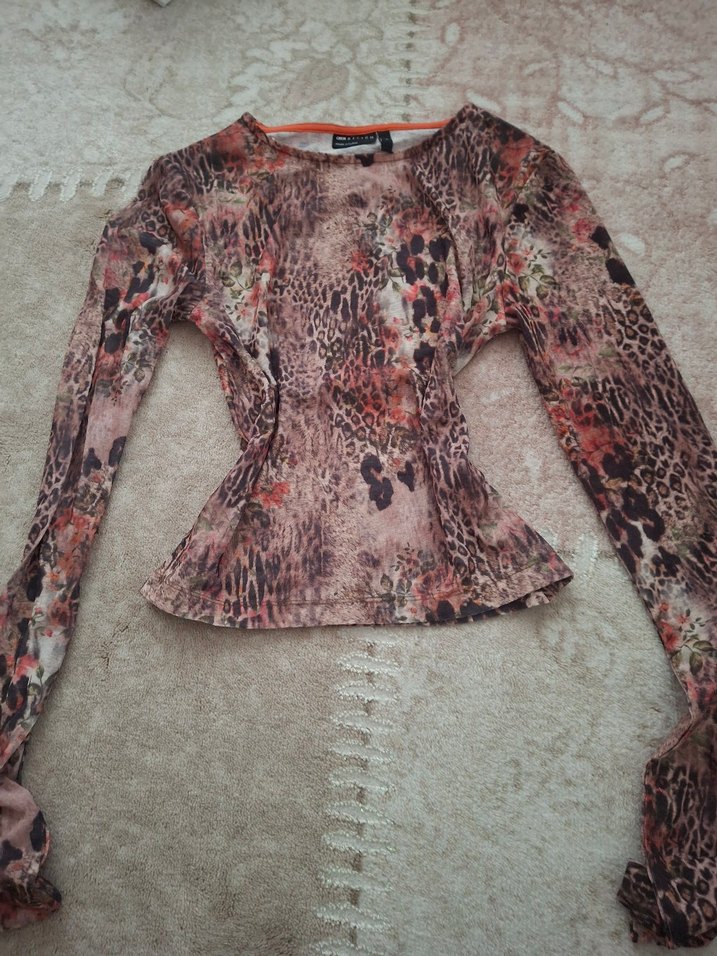 Kahverengi, uzun kollu, sentetik kumaştan yapılmış, bohem tarzda, kürk detaylı, normal boyda, dar kesim kadın bluz. S beden. Bedeni tam sariyor.