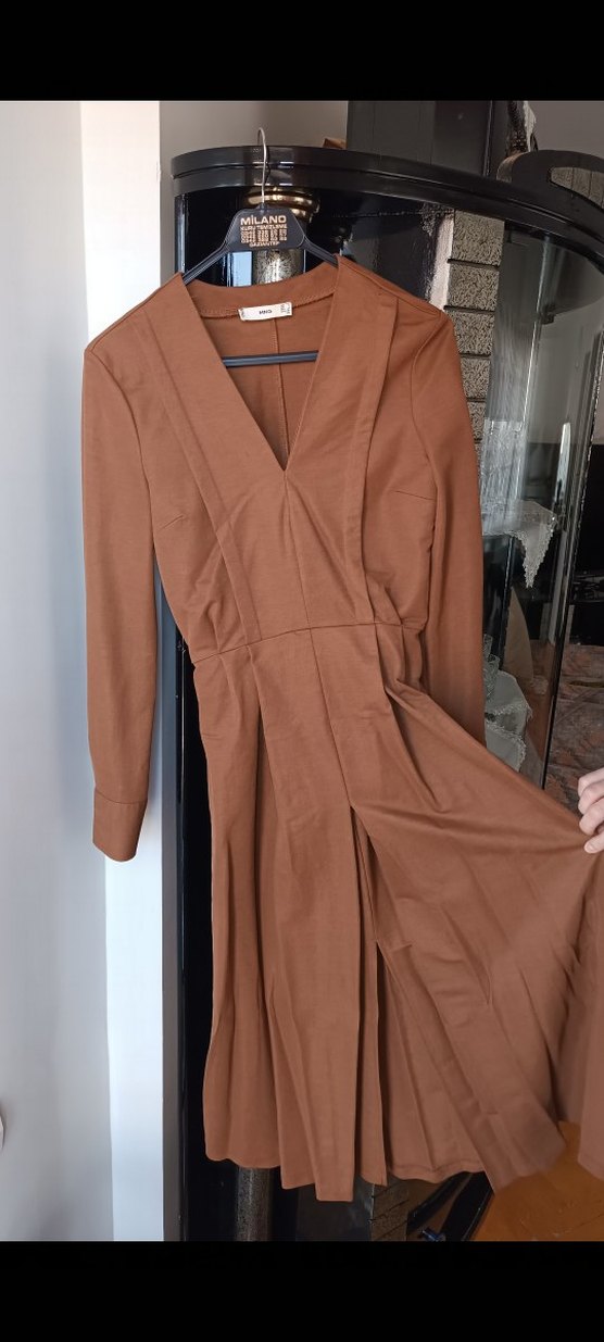 Kahverengi uzun kollu elbise, yakasında keskin yaka detayı ve dökümlü tasarımıyla günlük kullanıma uygun şık bir görünüm sunar.