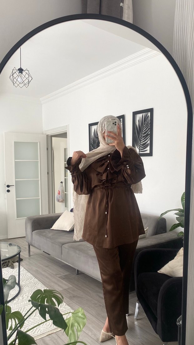 Kadın takımı, bol kesim, yüksek yakalı ve uzun kolludur. İpeksi kumaştan üretilmiş, kemer detaylı, koyu kahverengi ve desensizdir, günlük kullanıma uygundur.