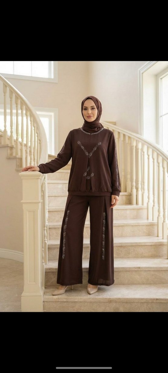 Uzun kollu, yüksek yakalı ve etnik desenli kumaş türü oyşho kahverengi kadın takımı. İpek gibi dokusu ve dökümlü yapısıyla günlük kullanıma uygundur.