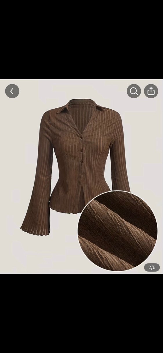 Kahverengi kadın gömlek, piliseli uzun kollu ve yakası kesik detaylıdır. Yumuşak keten kumaş, normal kesim ve midi boy ile Paris tarzı ofis şıklığı sunar.
