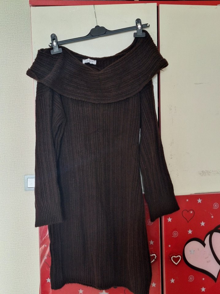 Bu koyu kahverengi triko elbise /kazak Madonna yakadır Kazak kumaşı vardır tesettürlü kadınlar kazak olarak kullanabilir. Kalçayı kapatır 162 boyum var rahatlıkla kapatıyordu. Denemek için giydim 1 kez onu dışında ürün hiç bir şekilde kullanılmadı. Alt göbeğiniz çok yoksa rahatlıkla kullanabilirsiniz var sa elbiseyi yukarı çekiyor. Onun dışında oldukça esnek kumaşı var beden aralığı 34-46(alt göbeğiniz yoksa) diyebilirim.