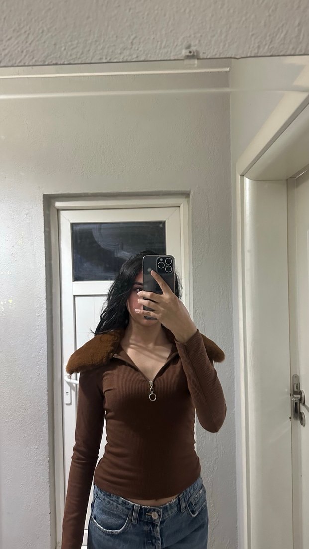 Ön kısmında fermuar detayı bulunan kahverengi uzun kollu, yumuşak yakalı, vücuda oturan kadın üstü.