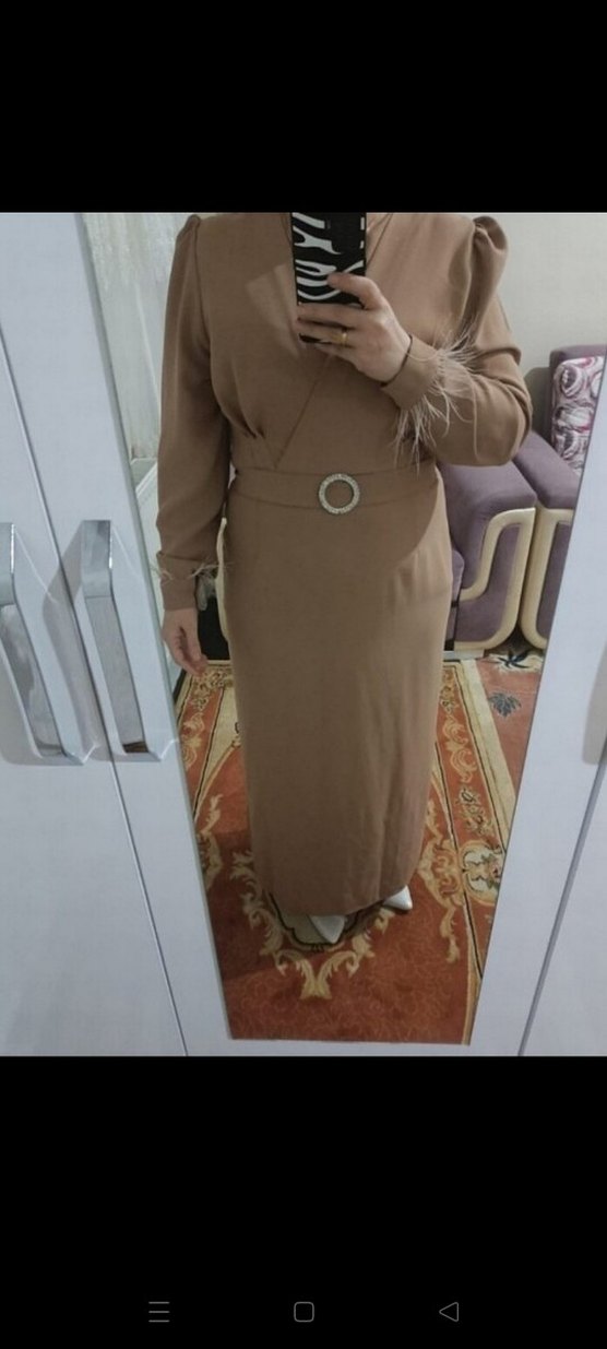 Kahverengi uzun kollu, kemerli, düz desenli elbise. Rahat kalıp ve sentetik kumaştan, günlük kullanıma uygun şık bir modeldir.