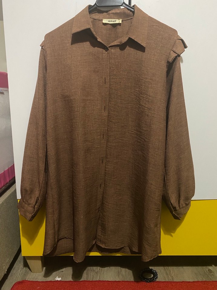 Kahverengi keten kumaştan, uzun kollu, yakalı ve düğmeli önü olan bol kesim uzun gömlek. Rahat ve bohem tarz için uygundur.