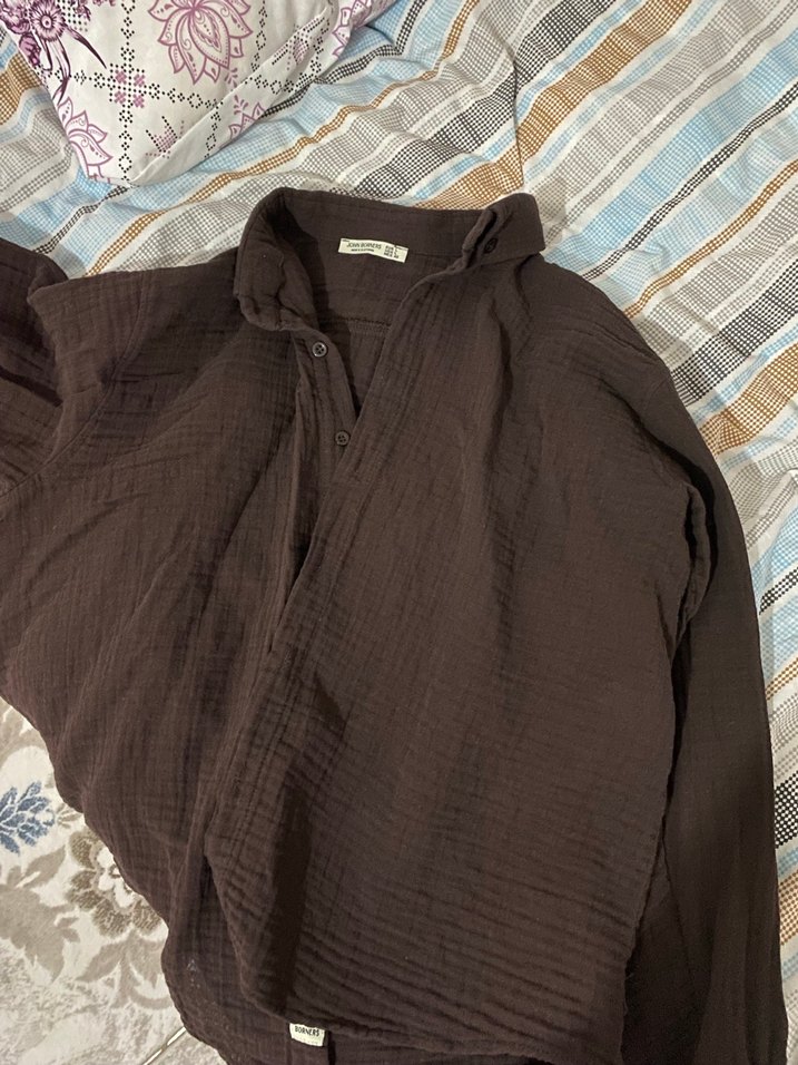 Kahverengi keten kumaştan, uzun kollu, düğmeli ve yüksek yakalı, bol kesim kadın gömleği. Günlük kullanıma uygun sade tasarım.