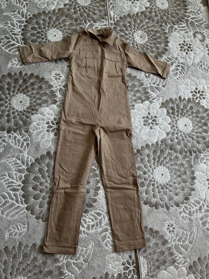 Kahverengi uzun kollu keten tulum, notlu yaka ve regular fit ile günlük kullanıma uygun rahat ve şık bir seçim sunar. Rahat sokak stili için ideal, zahmetsiz şıklık sağlar.