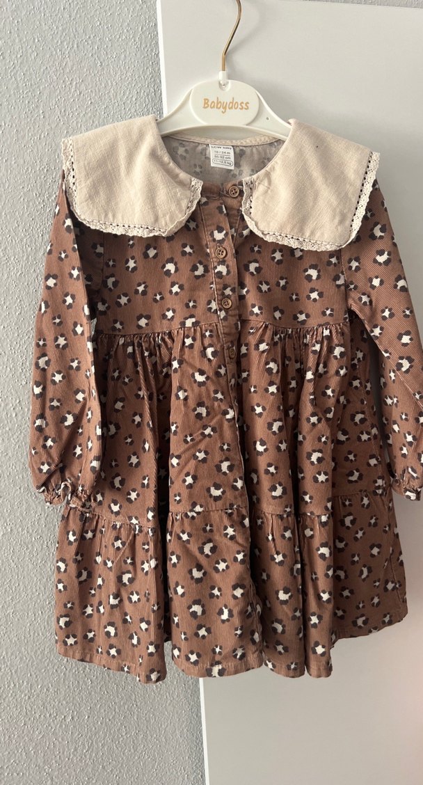 Kahverengi, uzun kollu, bol kesim kız elbisesi. Yakalı ve fırfırlı detaylara sahip, baskılı desenli. Yumuşak ve sıcak kumaştan. Markası Babydoss.